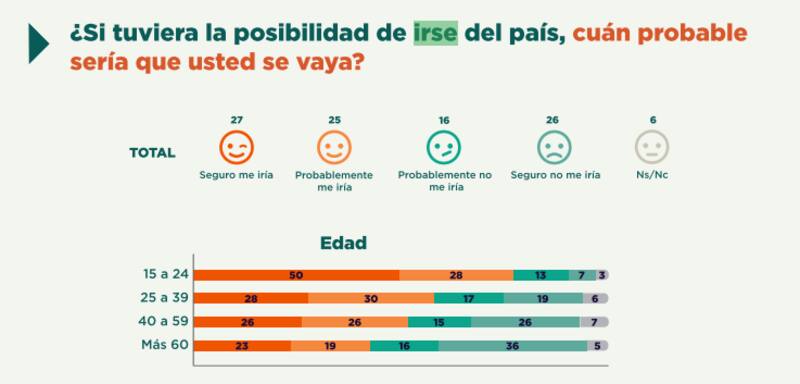 En la medición, el 50% aseguró que "seguro se iría", mientras que el 28% sostuvo que "probablemente se iría". Estos porcentajes son los más altos en el segmento de 15 a 24 años y bajan cada vez que aumenta la edad de los encuestados, además de ser una tendencia más marcada en las ciudades más grandes.