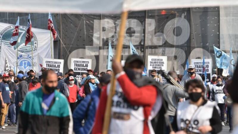 El "Piquetazo" nacional motorizado por unas 50 agrupaciones sociales en 20 provincias llevó la protesta social este miércoles en el microcentro porteño a los niveles de la prepandemia. Miles se movilizaron desde Avellaneda hasta el Obelisco y reclamaron a las puertas del ministerio de Desarrollo Social una mayor descarga de recursos sobre los sectores más golpeados por la crisis económica.