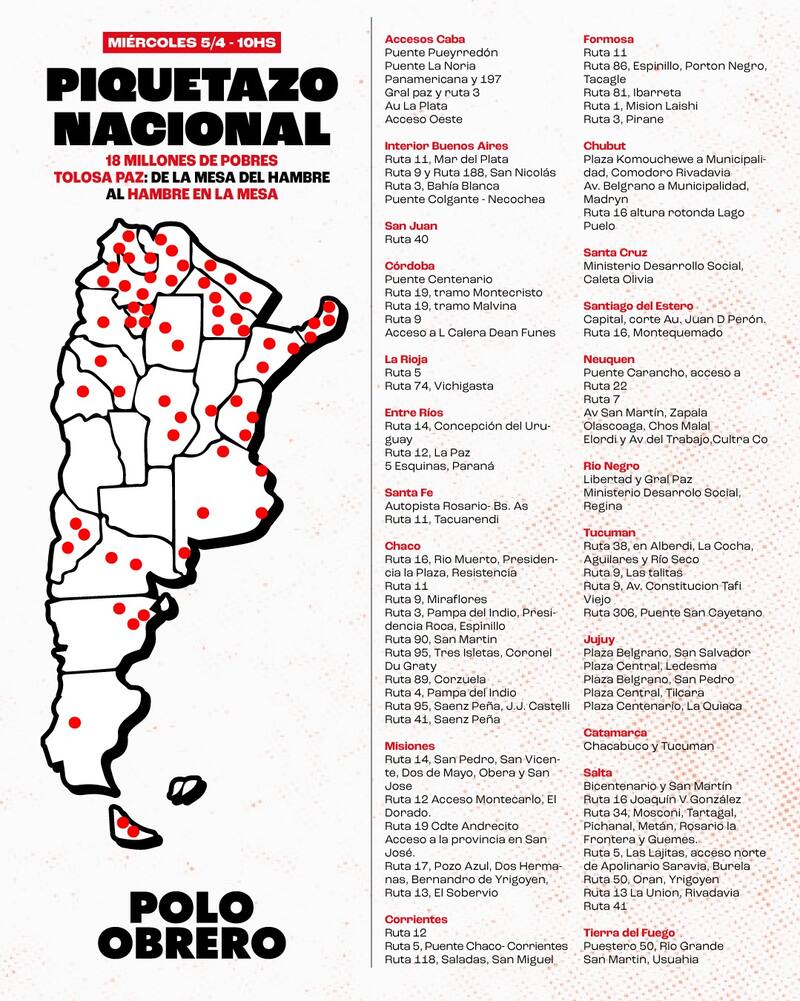 Según los planes de la Unidad Piquetera, la protesta del 5 de abril tendrá lugar en más de 135 ciudades del país, y se prevé que tenga un alto impacto en la circulación, con cortes de calles y accesos. Además, está prevista una "gran marcha" entre el 15 y el 17 de mayo próximo, también como parte del plan de lucha definido en el plenario de marzo.