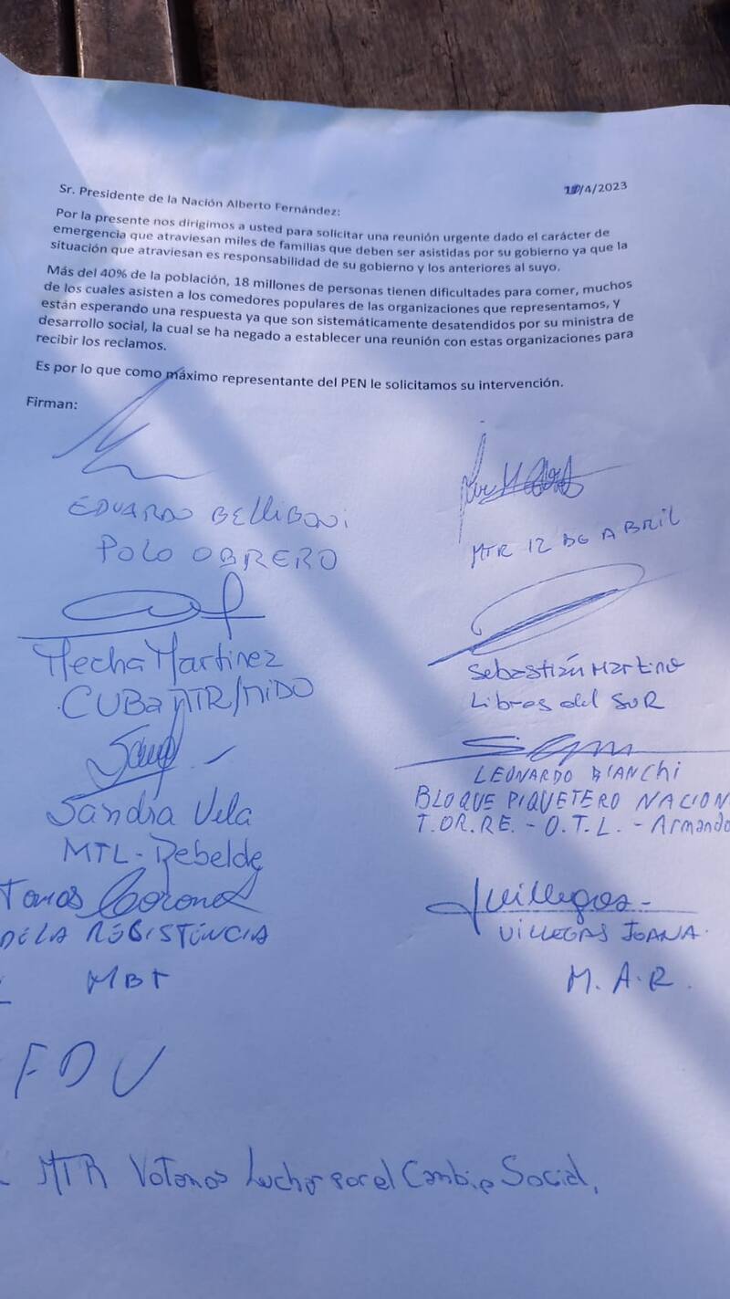 "Más del 40% de la población, 18 millones de personas tiene dificultad para comer, muchos de los cuales asisten a los comedores populares de las organizaciones que representamos y están esperando una respuesta ya que sistemáticamente desatendido por su ministra de desarrollo social, la cual se ha negado a establecer una reunión con estas organizaciones para recibir los reclamos", finaliza la petición que fue firmada por el Polo Obrero, Libres del Sur, y el MTR entre otras agrupaciones sociales.