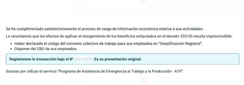 Una vez finalizado el proceso, el sistema comunica que la carga de la información económica se realizó correctamente e indica que resulta imprescindible que el interesado tenga declarado en "Simplificación registral" el convenio colectivo de trabajo de sus empleados.
