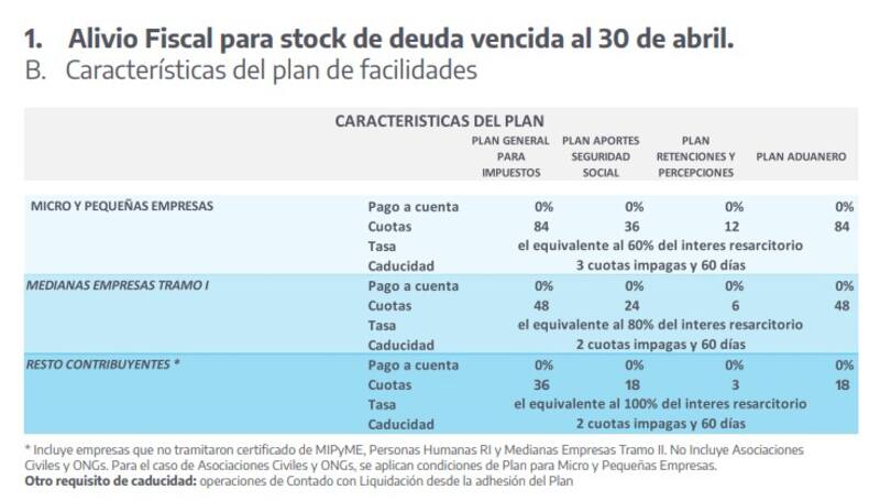 El nuevo plan de pagos alcanza hasta las 84 cuotas para las micro y pequeñas empresas en el caso de impuestos generales y aduaneros, mientras que el top es de 36 cuotas para aporte a la seguridad social y 12 para retenciones y percepciones, con una tasa equivalente al 60% del interés resarcitorio. El plan caduca con 3 cuotas impagas y 60 días.