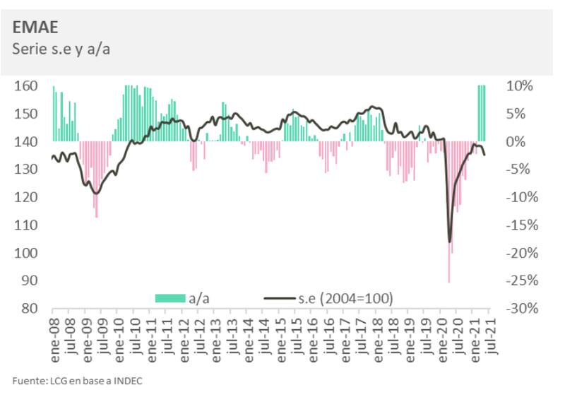 En esta línea, aunque en junio se verán datos de rebote en el EMAE, se espera un crecimiento de entre un 6% y 6,5% para este año, la mayoría por arrastre estadístico. Así, la economía finalizaría el 2021 con un nivel de actividad por debajo del máximo que se alcanzó en noviembre de 2017.