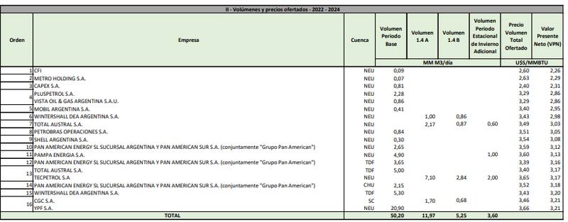 Como anticipó El Cronista el 3 de diciembre, los precios van desde los u$s 2,40 por millón de BTU a los u$s 3,66, para tener un promedio ponderado cercano a los u$s 3,50 y un volumen adjudicado de 67,42 millones de metros cúbicos por día (MMm3/d) en el bloque base.