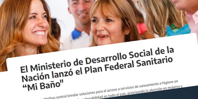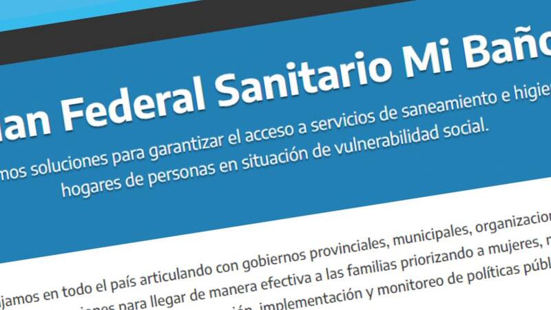 El Plan Mi Baño, lanzado en 2023 por el Ministerio de Desarrollo Social, tiene como finalidad "brindar soluciones para el acceso a servicios de saneamiento e higiene en los hogares de las personas en situación de vulnerabilidad, priorizando la atención de mujeres y niñas".