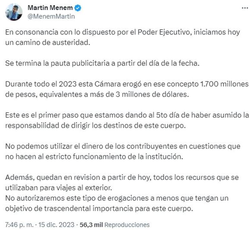 El flamante presidente de la Cámara de Diputados, Martín Menem, anunció este viernes una serie de recortes que implementará en los recursos que administra en la Cámara Baja. Apuntó especialmente a la pauta publicitaria y a los viajes al exterior.