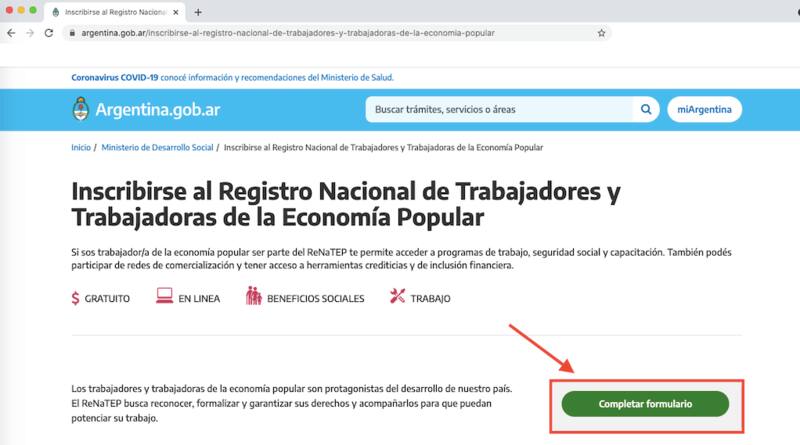 1. Entrar en la página web oficial: www.argentina.gob.ar/inscribirse-al-registro-nacional-de-trabajadores-y-trabajadoras-de-la-economia-popular