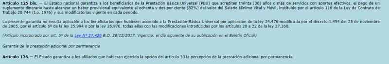De acuerdo al artículo 125 bis incorporado a la Ley 24.241 del Sistema Nacional del Sistema Integrado de Jubilaciones y Pensiones, el Estado nacional "garantiza a los beneficiarios de la Prestación Básica Universal (PBU)" que acrediten treinta (30) años o más de servicios con aportes efectivos, "el pago de un suplemento dinerario" hasta alcanzar un haber previsional equivalente al 82% del valor del Salario Mínimo, Vital y Móvil (SMVM).