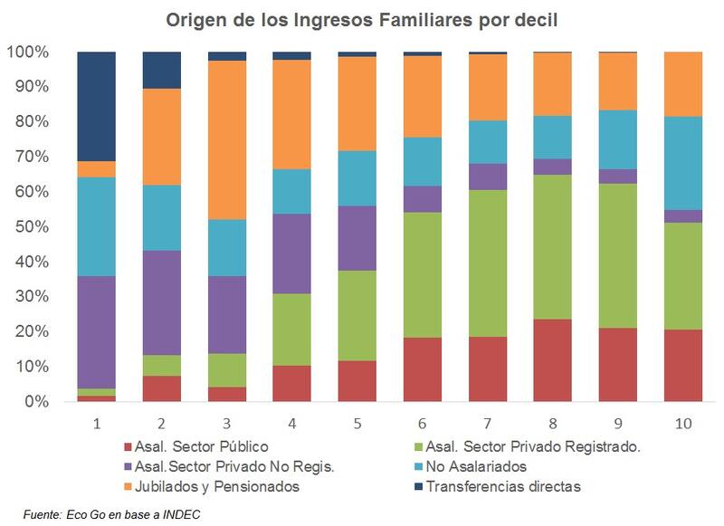 Si se analiza el origen de ingresos de las familias por decil, en los más bajos llegan a depender más de un 30% de transferencias del Estado y el empleo no registrado fluctúa entre el 30 y 20%.