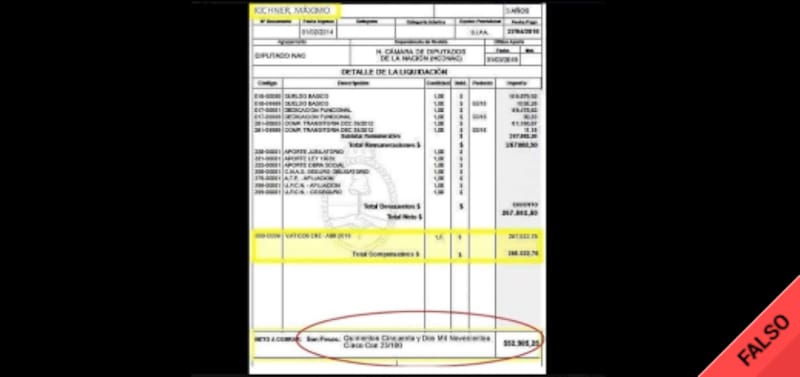 El supuesto recibo tiene algunos errores evidentes: está mal escrito su nombre (dice “Kichner, Máximo sin la “r ) y la palabra “excento (sic). Además, es errónea la fecha de ingreso ya que figura "febrero de 2014", cuando el líder de La Cámpora fue elegido en octubre de 2015 y asumió el 10 de diciembre de ese mismo año.