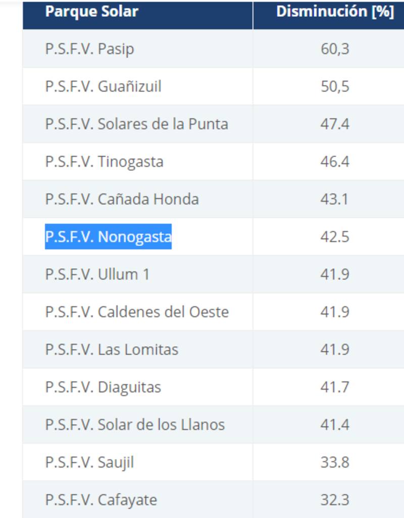 Al mismo tiempo, los tres parques solares de Cauchari, en Jujuy, inaugurados este año y con una potencia de 100 MW cada uno, tendrían una reducción del 20%.