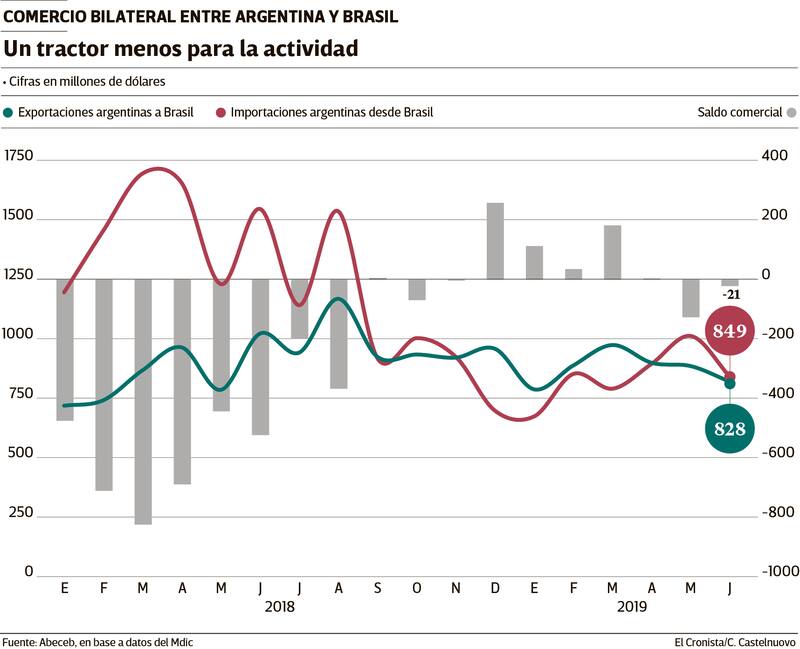 Parte de este cambio de perspectivas se refleja en los números de intercambio comercial que ayer difundió el Ministerio de Industria, Comercio Exterior y Servicios de Brasil. En junio las exportaciones brasileñas totalizaron u$s 18.047 millones, un 10,3% menos que el mismo mes de 2018, mientras que las importaciones llegaron a u$s 13.027 millones, con una caída de 9% interanual.