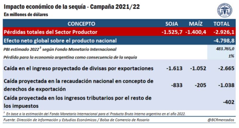 Según un trabajo de la Bolsa de Comercio de Rosario (BCR), la sequía ya le ocasionó a la cosecha gruesa del campo una pérdida de 2930 millones de dólares y, en total el impacto sobre la economía argentinaserá de 4.800 millones de dólares o un 1% del PBI.