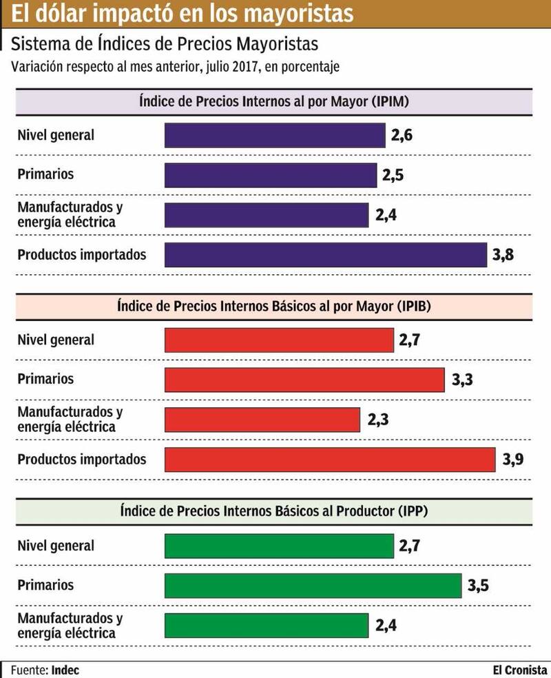 En tanto, el Índice de Precios Internos Básicos al por Mayor (IPIB) y el Índice de Precios Básicos del Productor (IPP) exhibieron ambos una suba de 2,7% mensual. Esto es 1 punto porcentual por encima del movimiento de los precios minoristas en julio, que llegó a 1,7%.