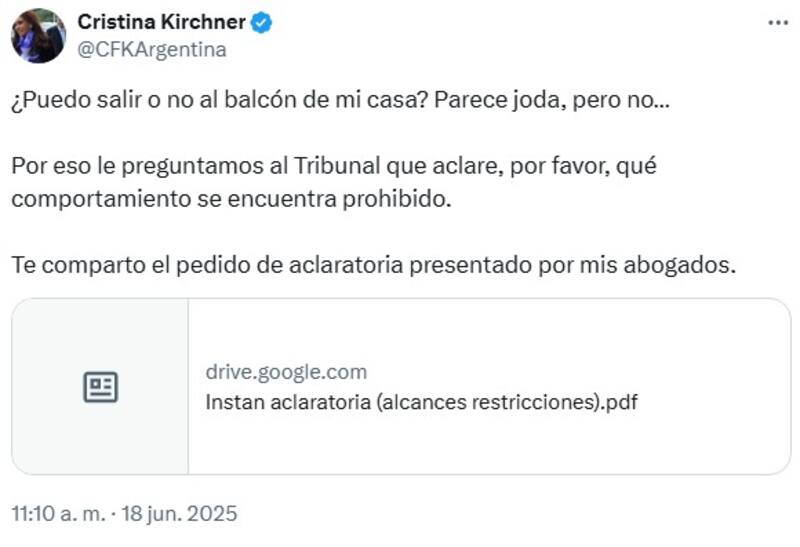 "¿Puedo salir o no al balcón de mi casa? Parece joda, pero no... Por eso le preguntamos al Tribunal que aclare, por favor, qué comportamiento se encuentra prohibido", escribió este miércoles en su cuenta de X.