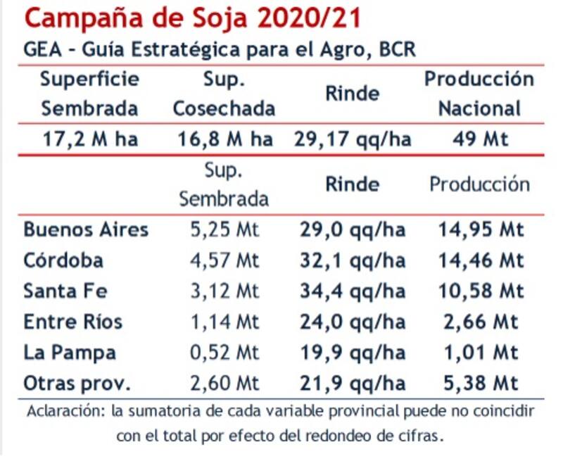 Según la proyección de cosecha de febrero la soja llegará a 49 millones de toneladas, y la de maíz, pasará de 46 millones de toneladas a 48,5 millones.