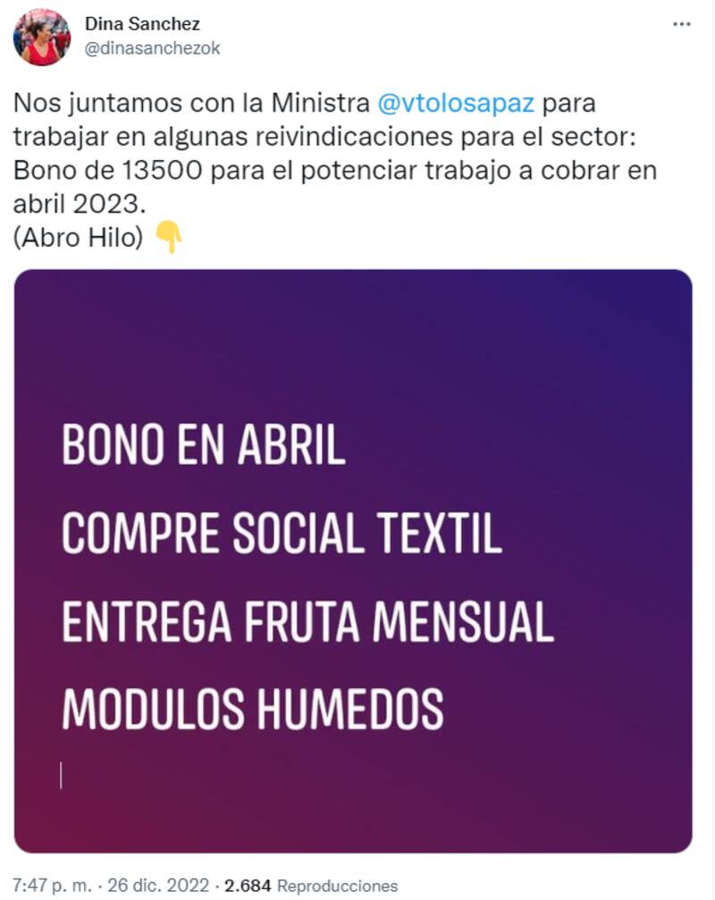 "Nos juntamos con la ministra Victoria Tolosa Paz para trabajar en algunas reivindicaciones para el sector: bono de 13500 para el Potenciar Trabajo a cobrar en abril 2023", confirmó semanas atrás la secretaria general adjunta de la Unión de Trabajadores y Trabajadoras de la Economía Popular (UTEP), Dina Sánchez, vía Twitter.