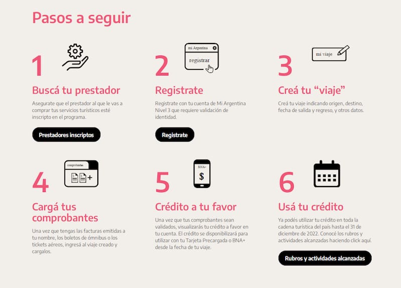 La inscripción se realiza en la web www.previaje.com.ar, luego de registrarse con la cuenta de Mi Argentina. El último paso que es cargar las facturas es el que actualmente presenta problemas.