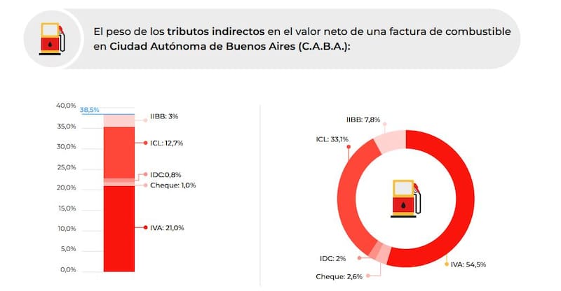 El análisis reflejó que en Capital Federal, al consumo neto de combustible por parte de un ciudadano (medido en litros) se le suma una carga del 38,5%: el IVA representa el 54,5% del total de la carga y el ICL el 33%.