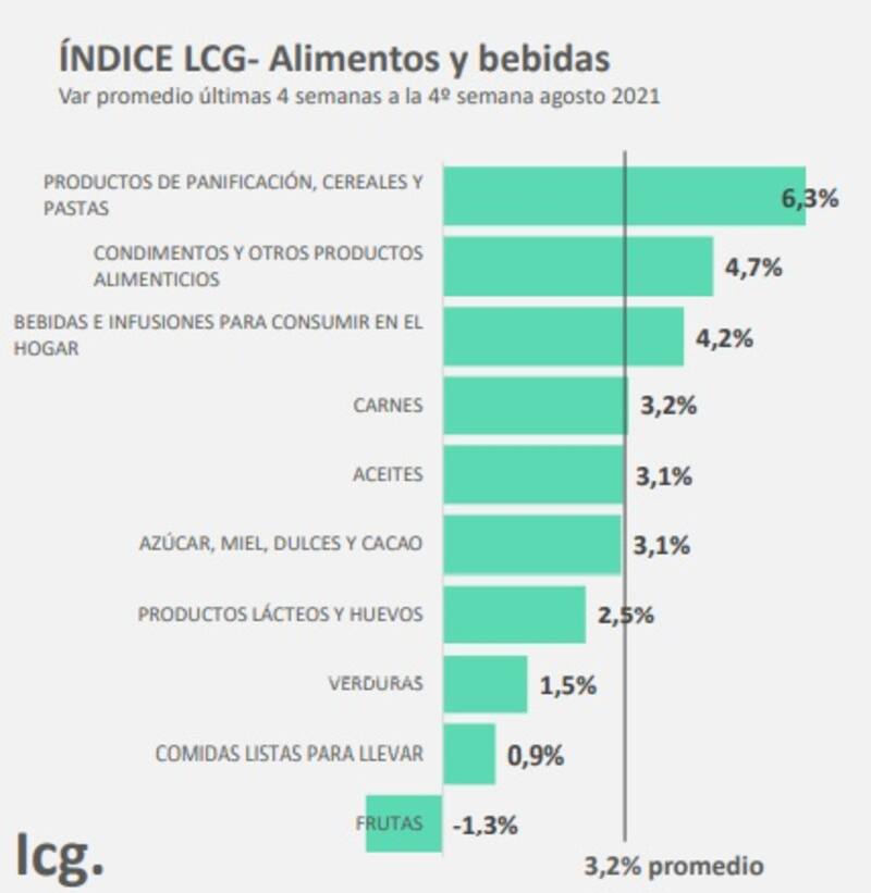 Según el relevamiento semanal de la consultora LCG -8000 productos en 5 cadenas de supermercados-, en la cuarta semana de agosto la inflación en alimentos llegó al 1% y de esa manera en las cuatro semanas del mes la suba trepó al 3,2%, tanto en el promedio del período como en la medición punta a punta.