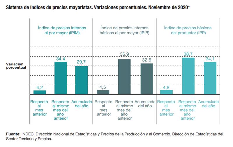 Los precios mayoristas subieron un 4,2% en noviembre respecto al mes anterior y un 34,4% en la medición interanual, informó el Instituto Nacional de Estadísticas y Censos (Indec), por lo que en el año acumula 29,7%, pero encadenó ya seis meses por encima del 3,5%, lo que anticipa una fuerte presión para la inflación minorista en los próximos meses.