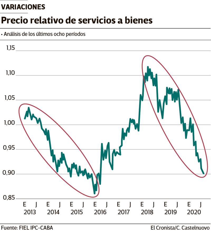 Estamos en tiempos de fuertes cambios de precios relativos, ya sea que se observen variaciones de tarifas, salarios, tipo(s) de cambio, tasas de interés o precios individuales. El gráfico muestra que la relación entre dos conjuntos de precios de grandes agregados, los "Servicios" y los "Bienes" en la canasta del IPC, presenta un ciclo bien marcado en los últimos ocho años (para no ir más atrás).