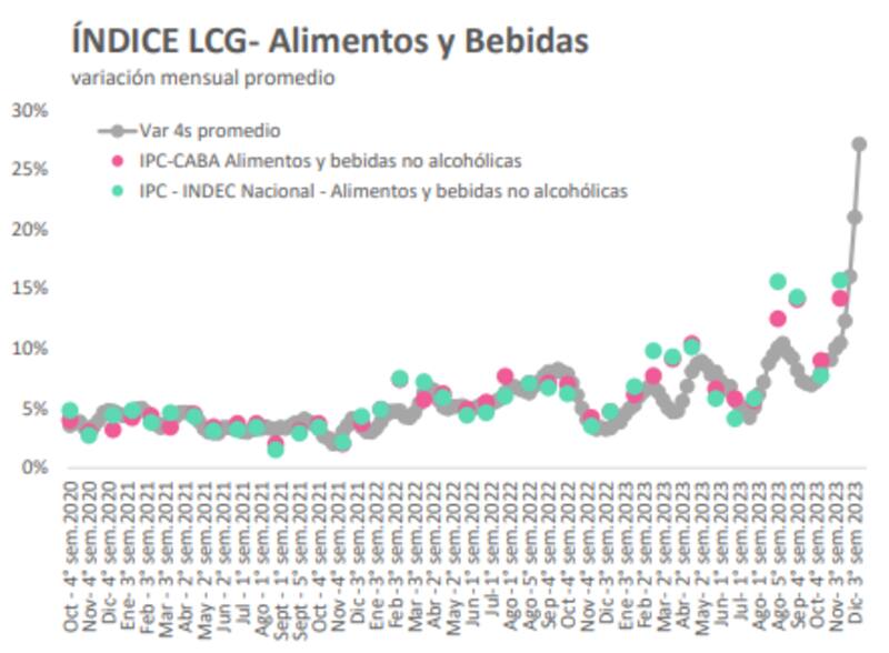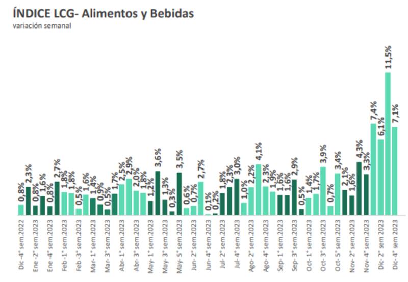 La cuarta semana de diciembre cerró con una inflación de 7,1% en alimentos y bebidas de acuerdo con el análisis de LCG. Si bien hubo una desaceleración de 4,4 puntos porcentuales contra la semana anterior, se registraron fuertes subas en algunos productos.