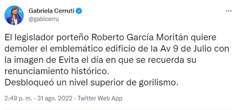 "El legislador porteño Roberto García Moritán quiere demoler el emblemático edificio de la Av 9 de Julio con la imagen de Evita el día en que se recuerda su renunciamiento histórico", comentó Gabriela Cerruti.
