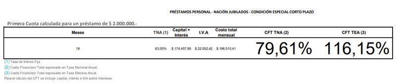 Nación Previsional habilita hasta $ 10.000.000 con una tasa nominal del 95,68% y se otorga a sola firma. El solicitante deberá autorizar al BNA expresamente al descuento de las cuotas de la cuenta abierta en esta entidad, o de sus haberes que liquida ANSES conforme el mecanismo de descuentos.