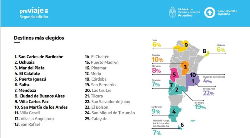 En este sentido, el top ten de las ciudades más elegidas como destino turístico en el marco del programa fueron: San Carlos de Bariloche, Ushuaia, Mar del Plata, El Calafate, Puerto Iguazú, Salta, Mendoza, Ciudad de Buenos Aires, Villa Carlos Paz y San Martín de los Andes.