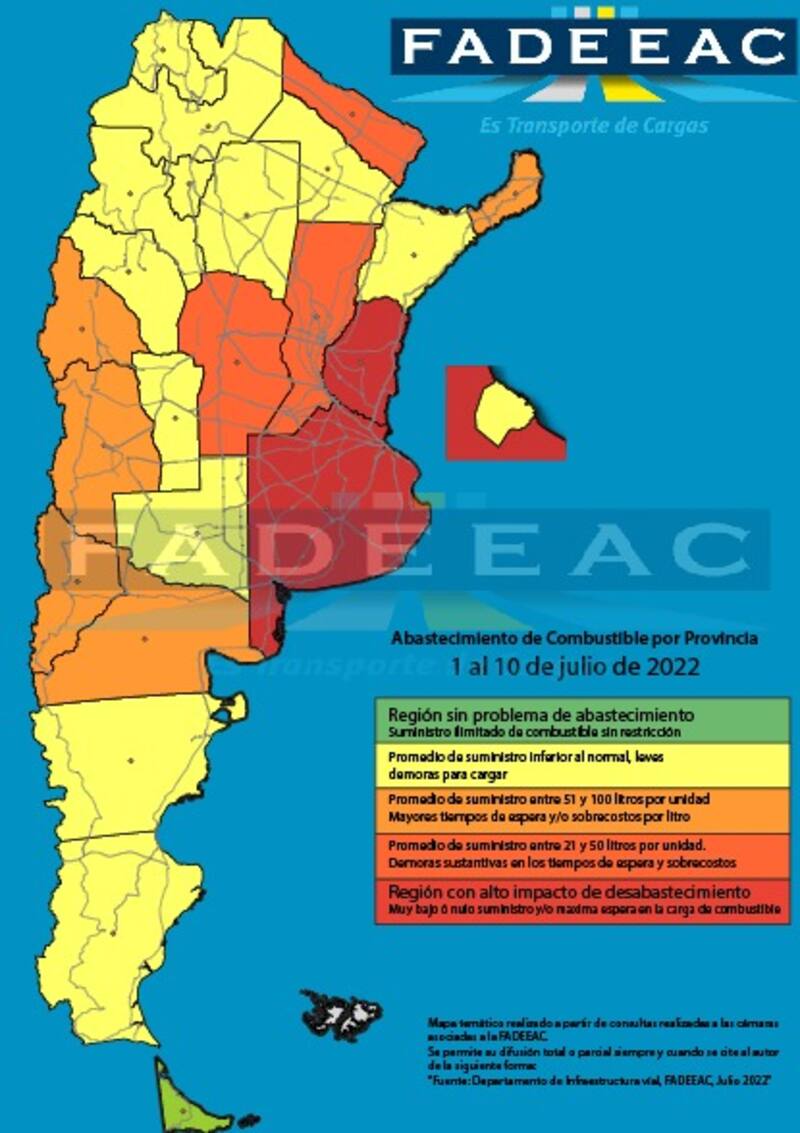 En el mapa realizado por la Federación Argentina de Entidades Empresarias del Autotransporte de cargas, Fadeeac, sólo dos provincias quedan en rojo profundo, aunque en 23 distritos se siguen registrando dificultades de distinta magnitud para el abastecimiento, como cupos o largos tiempos de espera para cargar, además de los altos precios.