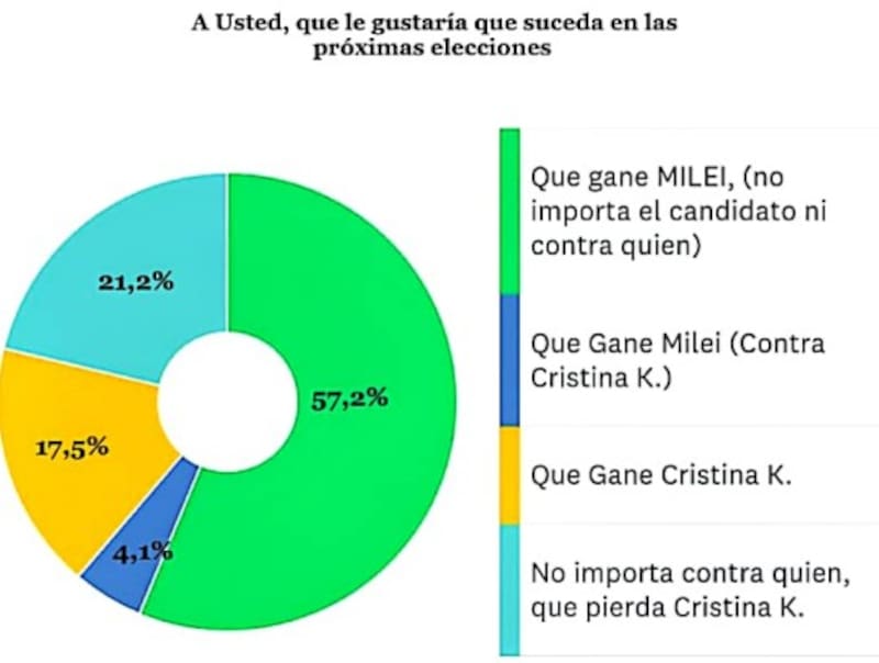 En base al relevamiento, solo el 17% quiere que gane Cristina Kirchner, en el eventual caso de que fuera candidata,en las próximas elecciones. Más de un 57%, en tanto, apoya un triunfo de Milei frente al candidato que sea. Y un 21,2% aseguró que no importa contra quien, pero que prefiere que pierda la exgobernante.