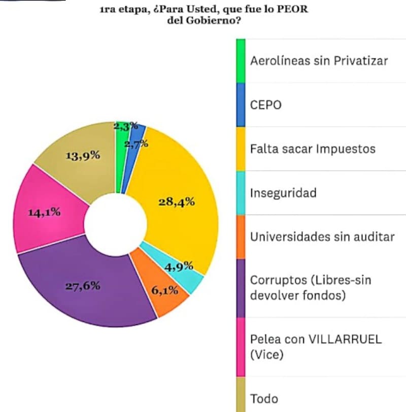 En contraposición, un 28,4% de los encuestados advirtió que Milei debe avanzar con la eliminación de impuestos. Otro llamado de atención importante fue sobre la corrupción: más del 27% expresó descontento debido a que los dirigentes condenados por corrupción "siguen libres o sin devolver fondos".