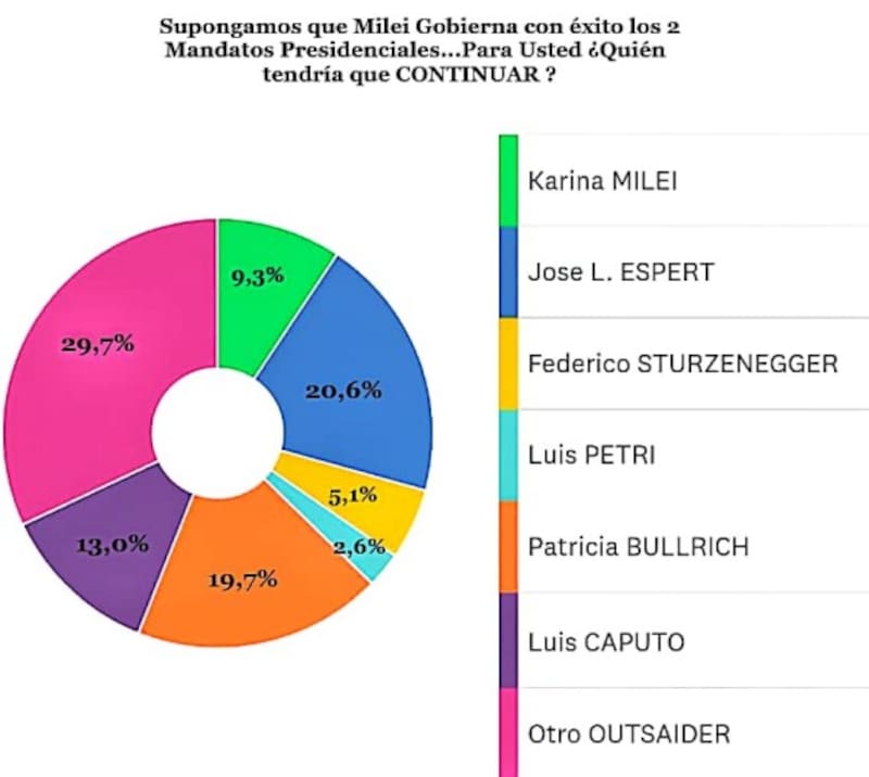 Por último, ante la pregunta sobre quién podría reemplazar a Milei si es que hace sus ciclos de gobierno con éxito, casi el 30% respondió que buscarían "otro outsider".