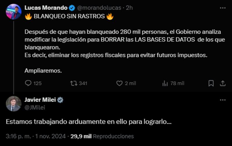 El presidente respondió a un tuit del periodista Lucas Morando en donde confirmó que el Gobierno está trabajando para borrar las bases de datos de los que blanquearon, con el objetivo de impedir que se use en el futuro esa información para nuevos impuestos.