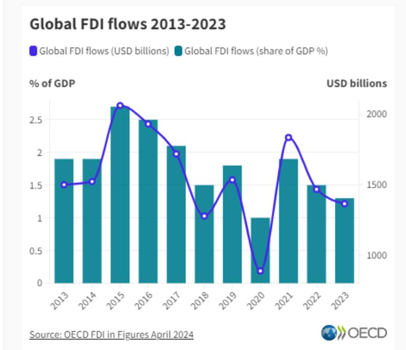 A nivel mundial los flujos de IED cayeron un 7% en 2023, a u$s 1.3 billones, lo que mantuvo una tendencia a la baja y por debajo de los niveles prepandémicos por segundo año consecutivo.