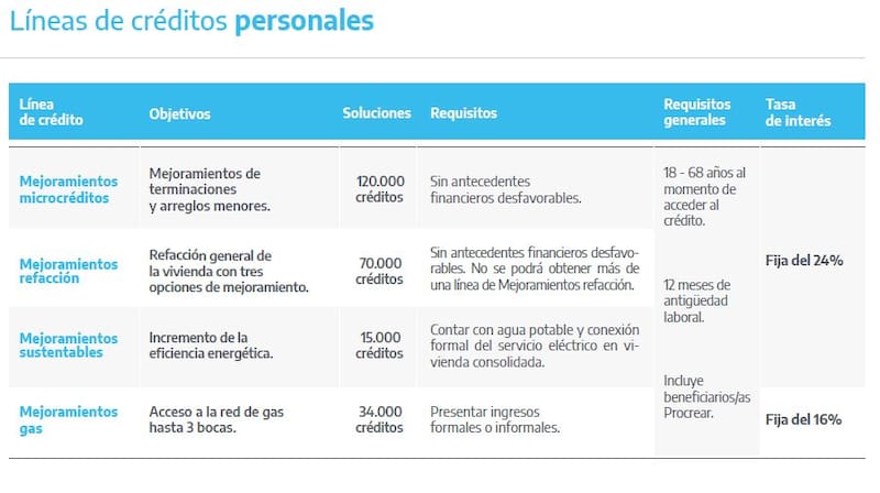 Microcréditos: para la compra de materiales, a fin de posibilitar obras de pequeña escala destinadas al mejoramiento de las condiciones habitacionales de las viviendas (filtraciones, terminaciones de núcleo húmedo, pisos, carpinterías, sanitaria o eléctrica, pintura, entre otros). Habrá 120.000 para todo el país, con una tasa fija de 24% y monto hasta $ 50.000.