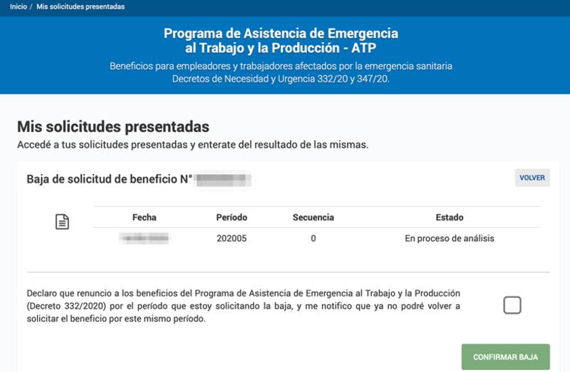 Para hacerlo, las empresas deberán ingresar con su clave fiscal 3 al portal de AFIP, al servicio del programa ATP. Allí podrán seleccionar la opción de solicitar la baja de los beneficios de mayo.