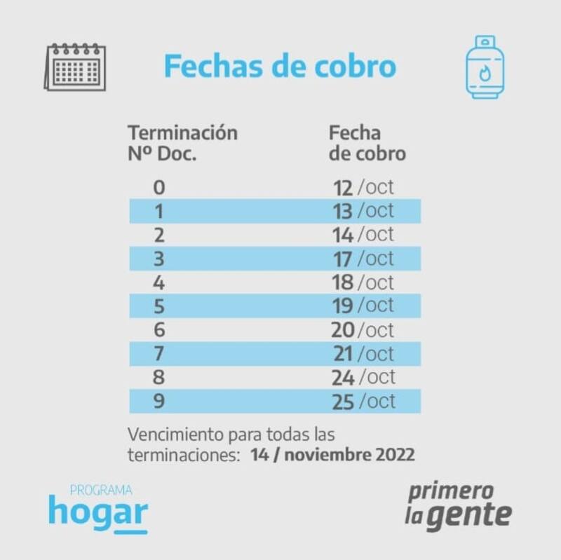 El calendario de pagos de octubre del Programa Hogarcomenzará la semana que viene y tras el feriado largo de octubre. Esta prestación es compatible con programas sociales de ANSES y está destinado a hogares de bajos recursos que no cuenten con una conexión a la red de gas y a entidades de bien público.