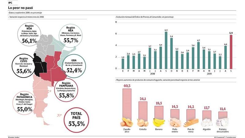 Los datos hasta ahora marcan una inflación en septiembre fue 5,9 %, según informó el Indec ayer. Con esta suba, en lo que va del año llegó a 37,7% y, en la comparación interanual, trepó a 53,5%.