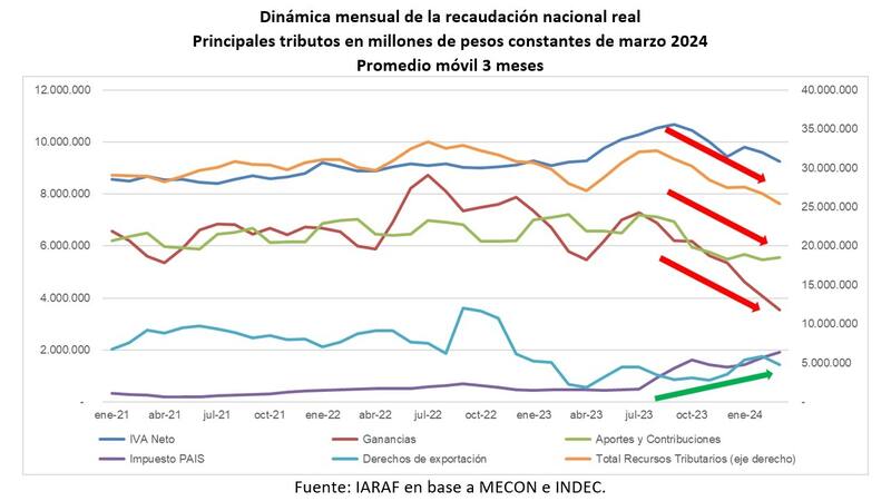 Los economistas de Eco Go calculan ingresos entre 2 y 3 puntos más por el capítulo fiscal de la ley ómnibus que podrían morigerar por otra parte el ajuste por el lado del gasto, un informe del Economista Nadín Argañaraz, director del Instituto Argentino de Análisis Fiscal (Iaraf), detalló que "solamente por el impacto de transferencias nacionales automáticas y no automáticas, el ingreso de las provincias habría caído entre un 1,8% y un 36,4% en términos reales durante el primer trimestre del año".