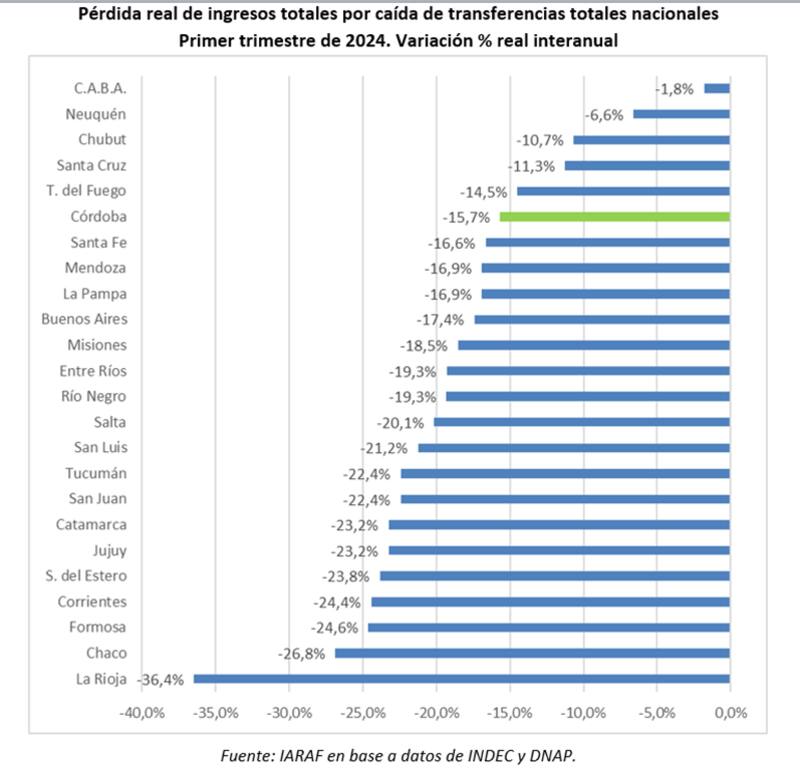 En el otro extremo se encuentra La Rioja, jurisdicción en la que las Transferencias nacionales no automáticas tienen la máxima participación. "En este caso el impacto puede haber sido del orden del 36,4%, una significativa caída", precisó Argañaraz. "En el medio están las restantes 22 jurisdicciones, siendo el promedio una baja real importante del ingreso".