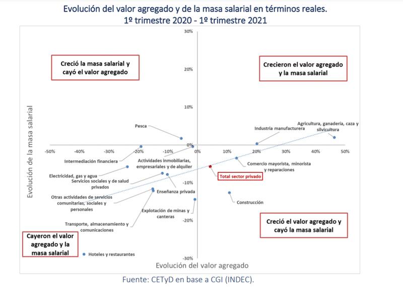 A nivel agregado, "es posible encontrar cierta correlación entre la evolución de la actividad económica y la de la masa salarial entre los distintos sectores de actividad", sostuvo el informe. Y añadió que si bien entre los primeros trimestres de 2020 y 2021 cayeron tanto el valor agregado como la masa salarial en la gran mayoría de los sectores, "puede observarse cierta tendencia que da cuenta dequela evolución de las remuneraciones fue más crítica en aquellas actividades que sufrieron una contracción más profunda".