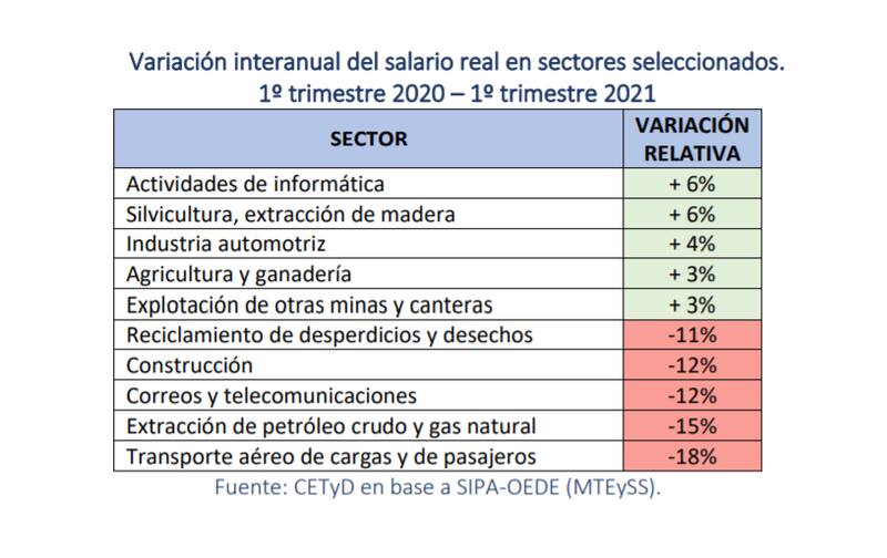 "La evolución de los salarios entre principios de 2020 y 2021 da cuenta de una importante heterogeneidad entre los distintos sectores de actividad", indicó el estudio. Entre los subsectores con mejor evolución salarial se encuentran el informático, ciertas actividades primarias y la industria automotriz. Por el contrario, entre los que se vieron más perjudicados están el transporte, la actividad de correos y la construcción, entre otros.