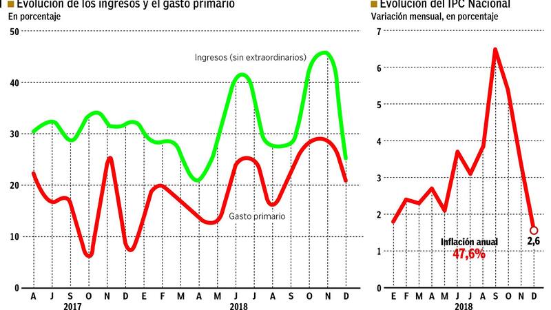 Sucede que la recesión estuvo ralentizando la recaudación: en diciembre, había crecido 36% interanual, contra una inflación de 47,6 por ciento. Y en noviembre, 33,7%, contra 48,5% del aumento de los precios minoristas.
