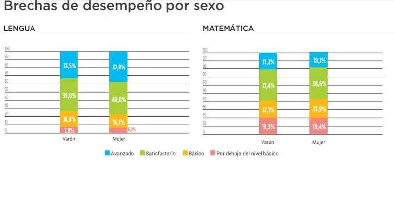 Por otro lado, en la clasificación por sexos, el informe mostró que los varones obtuvieron mejores resultados en matemáticas que las chicas (58,6% satisfactorio y avanzado contra 56,7%), que a su vez registraron cifras superiores en lengua (77,9% satisfactorio y avanzado frente a 73,3%). No obstante, ambas brechas se redujeron con respecto a 2016, cuando la diferencia era de 3 puntos porcentuales en lengua y de 7 puntos en matemáticas.