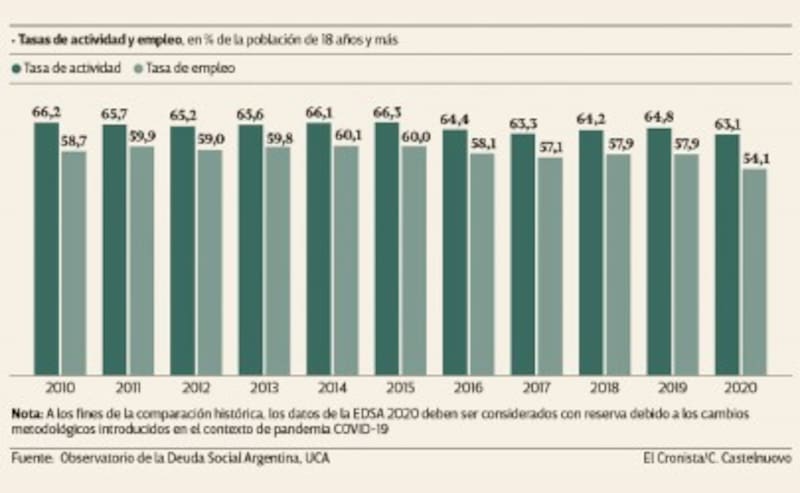 El documento añade que en 2020, sólo el 43,7% de la población económica activa de 18 años y más logró acceder a un empleo pleno de derechos. Mientras que el 13,9% de esta población se encontraba abiertamente desempleado y el 14,5% sometida a un subempleo inestable (realizando changas, trabajos temporarios o no remunerados, o siendo beneficiarios de programas de empleo con contraprestación).