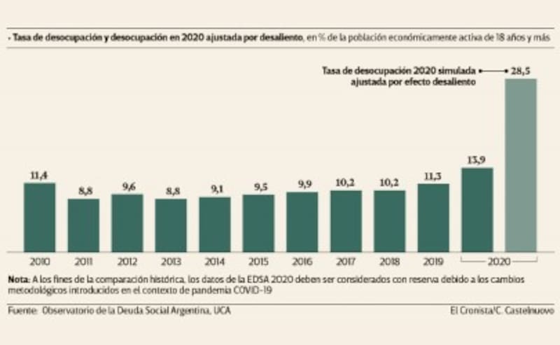 "La tasa de desempleo real del 28,5% registrada el año pasado supera por lejos al 21% de desocupación que se había registrado en la Argentina en el 2001 en un contexto de grave crisis. Esto es porque la tasa de medición tradicional no releva a aquellas personas que querían salir a buscar empleo pero que no pudieron hacerlo por las restricciones de la pandemia", explicó a El Cronista, Eduardo Donza, uno de los autores del informe de la UCA sobre desempleo.