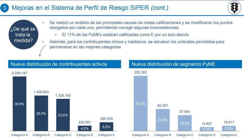 En el Siper, se corregirán algunas inconsistencias y elevar los umbrales permitidos para permanecer en las mejores categorías para los contribuyentes chicos y medianos. Hoy un 40% de los contribuyentes está en la mejor categoría (A) y solo 6,5% en la última (E).
