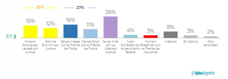 Juntos por el Cambio juntaría 27% con ambos candidatos en donde ganaría Larreta, Unión por la Patria obtendría el mismo porcentaje mientras que Milei quedaría a tan solo un punto. En esta encuesta el 8% de indecisos será clave para resolver quién queda primero.